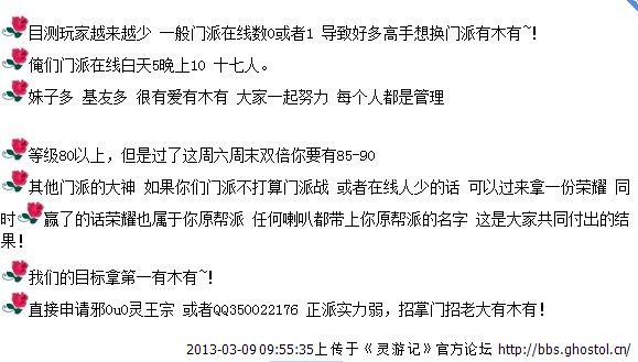 灵王是长期稳定发展的帮派,掌门我虽然PK很菜但是一直在用脑子绞尽脑汁和每天劳累的建设帮派。放眼望去,其他辉煌一时的门派内乱的内乱解散的解散要么就是无人上线。加入灵王宗,你会有一个稳定的小家