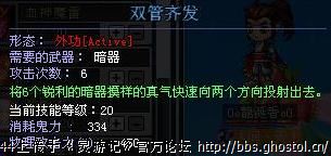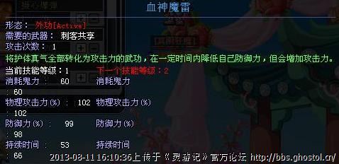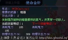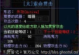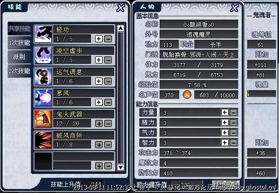 加点:力量、智力、精力都可以提高鬼魂者的攻击力,但是防御力只能通过装备和气力来提升,在装备只有一个符的情况下,防御极度不够,必须要加强气力来提升鬼魂者防御,所以在这里使气力与等级保持相等的增长态势是最佳的选择,但这么做会使得鬼魂攻击力不足,所以不同的职业可以适当减少加气,或是用强力的攻击来掩盖防御的不足,不过不言而喻的是越到游戏后期,鬼魂者的防御弊端就越会显现出来,只有能充分加气的职业才能崛起(我指刺客)。具体加点不用多说,除了气力我给的建议外,大家都能通过另外三种属性的叙述来找到合适的加点方式,记住,没有永远一成不变的配比,什么3智1气,3力1气,3精1气,都是不可取的,要随着情况的变化而变化,加智力气力的也可以加精力来额外提升攻击力,加精力过多的也可以加力量来弥补最小攻击力的不足,目前只是没发现有哪个非魔法攻击的职业要加智力来补充蓝不足的,不过我目前的121级镖刺倒是感到了蓝有点不够用。。。是否要加还有待观察,不过我宁愿加鬼力提升。从这一点也可看出,刺客貌似是对四种属性都有需求的全面职业。