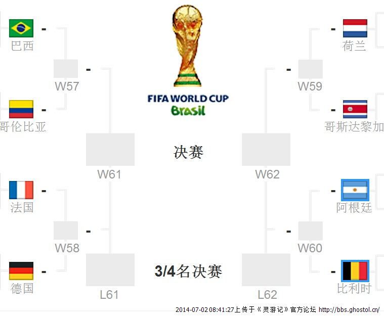 巴西、哥伦比亚、荷兰、哥斯达黎加、法国、德国、阿根廷、比利时预测开启时间:2014年7月2日9:00 —— 2014年7月5日00:00