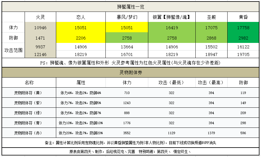 狮鹫&火灵属性一览(更新灵物附体券说明)