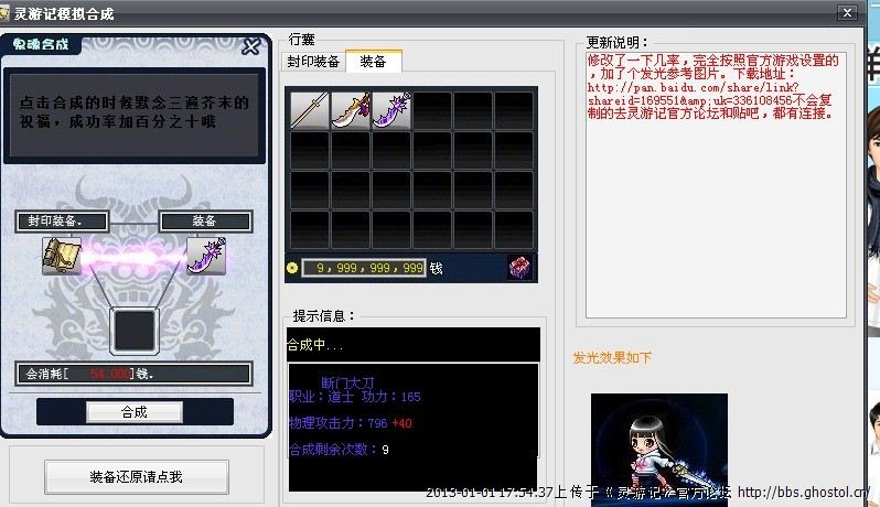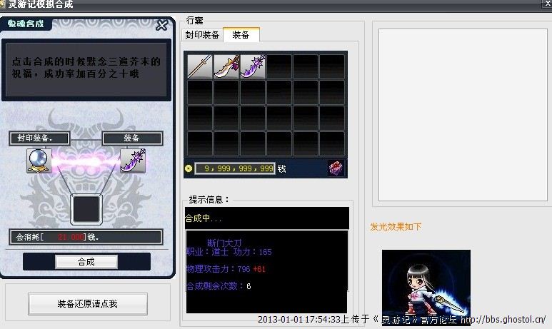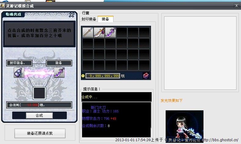 拿到+40还可以合8次(上图因为是模拟器 有无限的11回合成武器 实际游戏中必然是10回的普通武器。。。想在11回的稀有武器上连丢成2本天书开始合。。。这消耗我不敢想象 因此绝大部分出紫光的 其实是10回的普通武器 并不是期待的11回额外属性稀有武器)的武器之后 该垫一垫了 基本用宝珠或者葫芦 连爆3-4个葫芦 可以试着给武器上丢2-3个葫芦(失败其中一个的几率较高) 连爆2-4个宝珠 可以试着在武器上丢1-2个宝珠(连成和失败一个几率基本持平) 还有 别指望10次能全部成功 10次里能成7次就不错了 即便是紫光也就成了8次左右