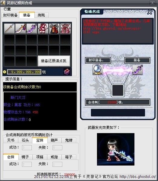 武器:念珠、鬼牌、葫芦、宝珠,没有垫装备,这是运气最好的一次了,效果才加50。。。而武器本身的攻击力是796,这提升按百分比算才0.06,就算加100才10%而已,但成功率我想大家都明白。。。