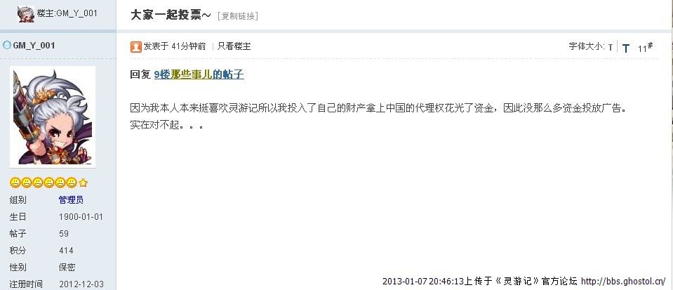 我也看到这个帖子了 并且给 GM-Y-001 回复了, 我不敢代表06内测以来的老玩家! 我只能代表我自己 会挺搞鬼! 我唯一挚爱的网游!并且对GM-Y-001表示我的敬佩,有这样的勇气决心,你会把你的公司给做大做强的!