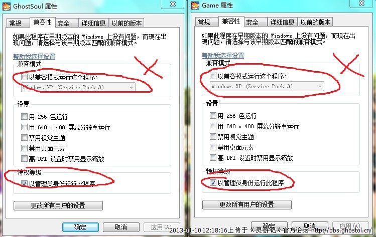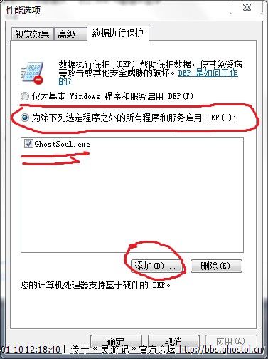 (方法已修改,请大家试用)"计算机"-属性-高级系统设置-性能设置-数据执行保护-选中"为除下列选定程序之外的所有程序和服务起用DEP"-只把GhostSoul的图标添加进去 就OK了 重新启动,GAME.EXE 和 ghostsoul.exe不要选择兼容模式,但是需要都点选上以管理员身份运行 ,稍后放图,我再关机测试几遍....