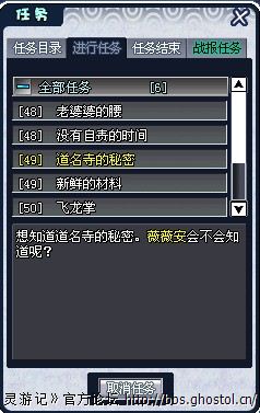这个道明寺的任务收集了萝莉的舌头之后就卡在宝芝林了,交了宝芝林结果没任务物品,而宝芝林再也无法对话了,除非放弃任务!GM帮我解解啊!