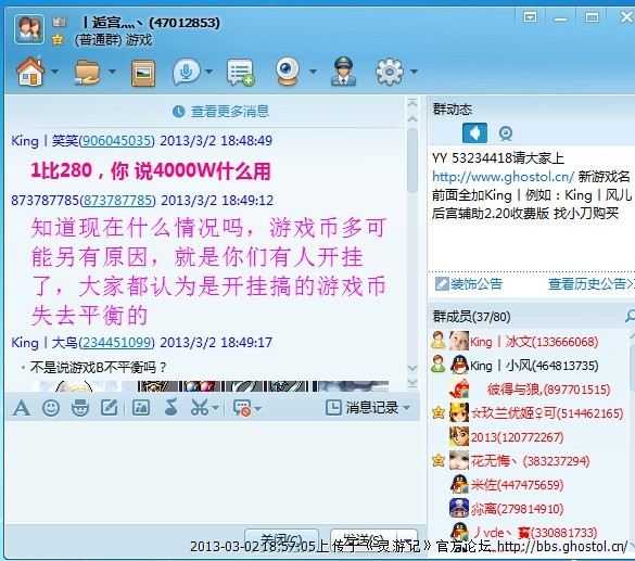 呵呵 大家看看吧 某版主靠着这群忠实的小弟 混上位置 然后在论坛高喊反挂~反挂到底~!一副正人君子的样子 背后呢? 后宫群 直接共享外挂 群公告直接写明 还是收费的 连找谁购买都写的清清楚楚 冰文群主 小风管理员 清晰可见 日产35亿却还为了平衡市场 努力的克制自己扫光全市场的冲动~ “游戏币 算什么?对我们后宫来说就他妈是一串数字! ”