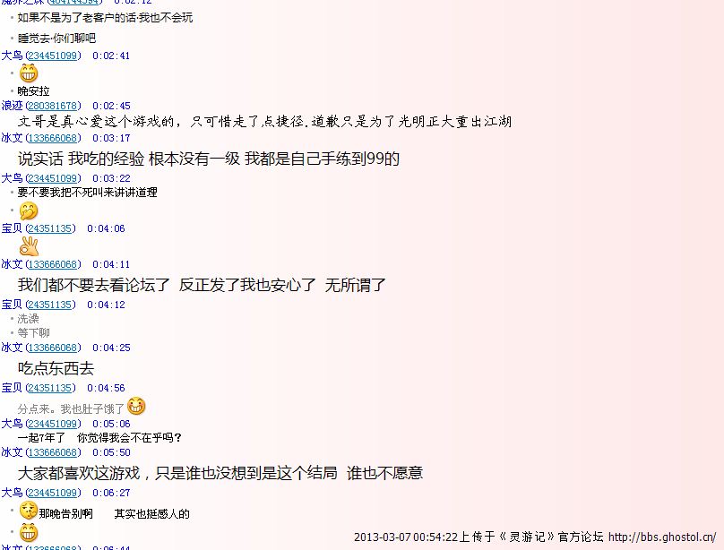 大家好,我是小V,有人或许认识我,有人或许不认识。但是不知不觉陪了这款游戏走了好久好久。陪着这群兄弟走过好多好多。感慨万分。从06到08, 又从08 走到了今天。 还记得前几个月 有个陌生的QQ加我。 说灵游记重开。 当时我以为是开玩笑的 或者骗子什么的 就没在意(其实是GM,因为我以前在网上解答搞鬼的问题,有留下我QQ所以就加我了吧。) 。 又过了几天 贴吧 群 都在说要重开。 当时心情很高兴。 我们后宫的群又热闹了起来。我们这群兄弟都很高兴。等了一阵子果然重开了。心中的喜悦 高兴。真是说不上来。 或许是真心喜欢。 才会有这种感觉吧。然后就玩到了现在, 前几天经历了一段挫折。 我想大家都知道。我就不在说了。后宫的大部分人都被封了。 我没封。但是我一点也不想玩了, 游戏早就卸载了。因为没有这群兄弟这游戏什么也不是!。 我们大家一起玩 大家一起笑。 如今我上了游戏。 只是看到了我一个人的身影。 门派一片漆黑。 就我一个上线。 这种难过的心情你们是不会理解的。 所以我卸载了。 不想去碰它。