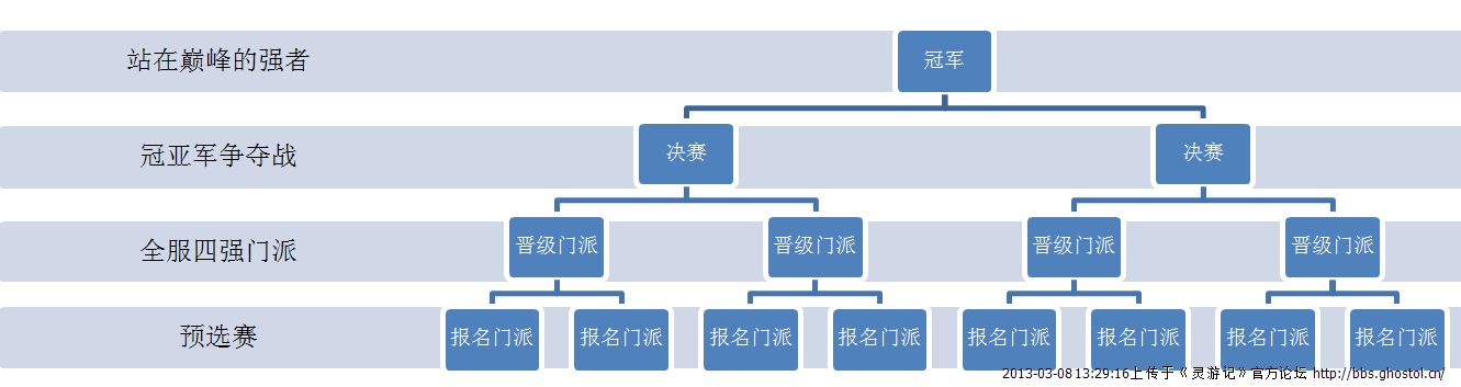 3.四强门派两个一组,比赛场次为一场,胜者进入冠军争夺战,败者进入季军争夺战;