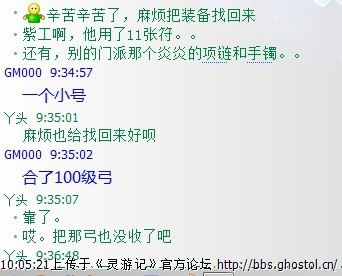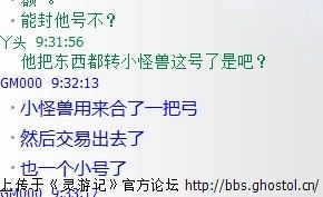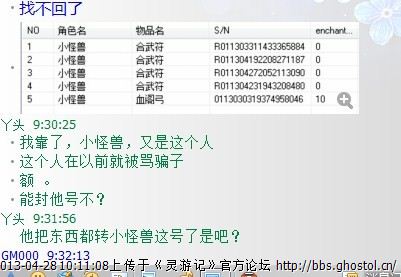 先上一张让GM帮忙查交易记录的图。GM回复被骗物品被转到这个小怪兽的号上了。而且已被这人使用。没法恢复。还有些聊天记录,希望大家看清楚。骗子是小怪兽