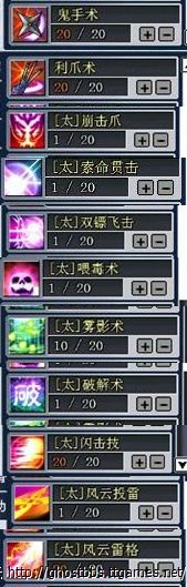 利爪术、鬼手术,这2个为基础技能,装备爪、手套增加基础攻击力,必满。